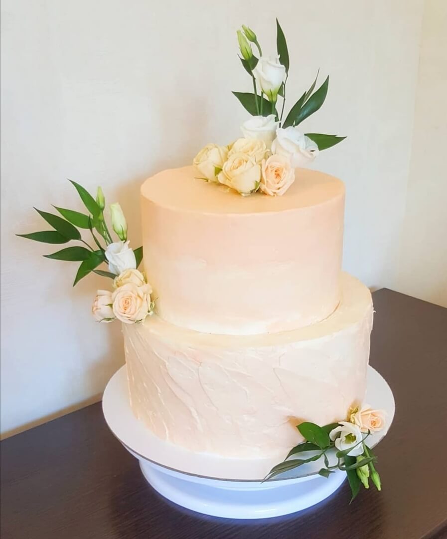Сладкий торт в нежном персиковом цвете с украшением из живых роз